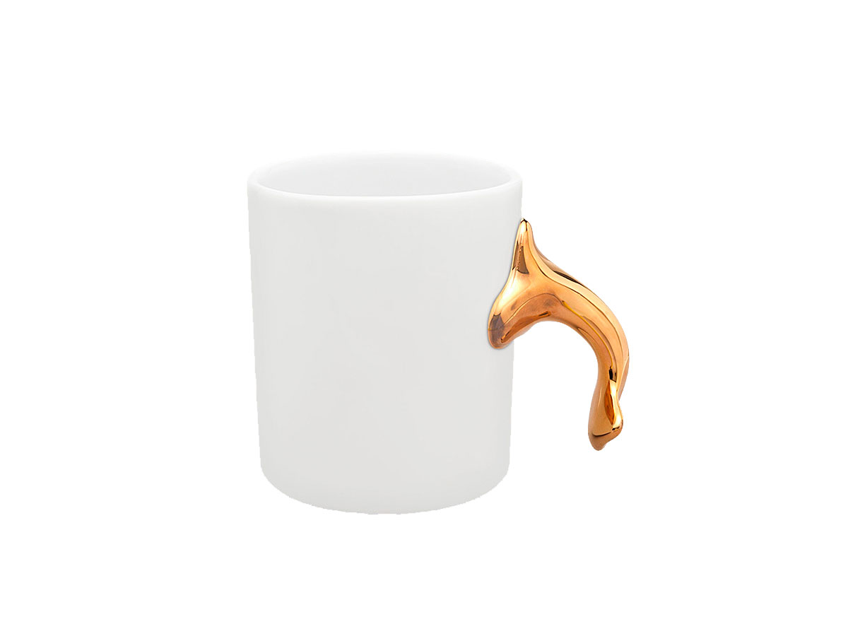 Taza blanca con asa dorada. Pieza de porcelana blanca y asa decorada a mano con oro. Diseñada por el arquitecto Quim Larrea a partir de los herrajes de Antoni Gaudí